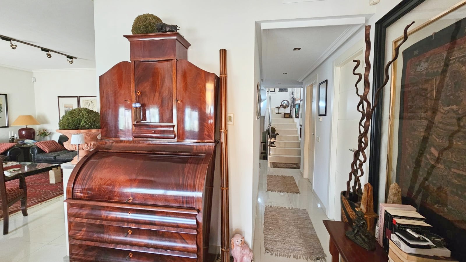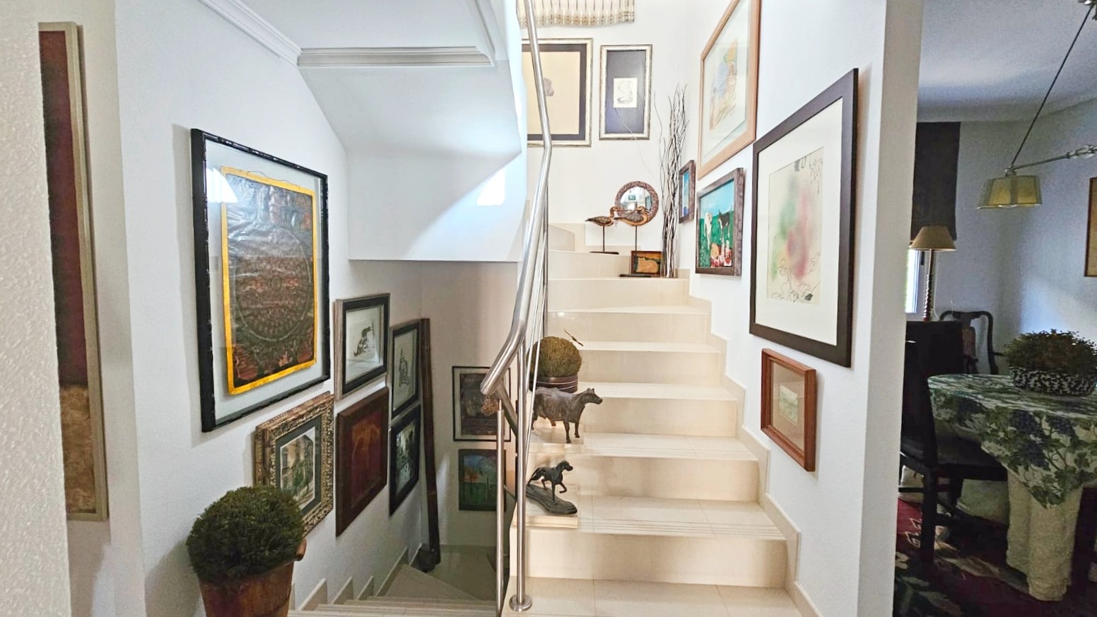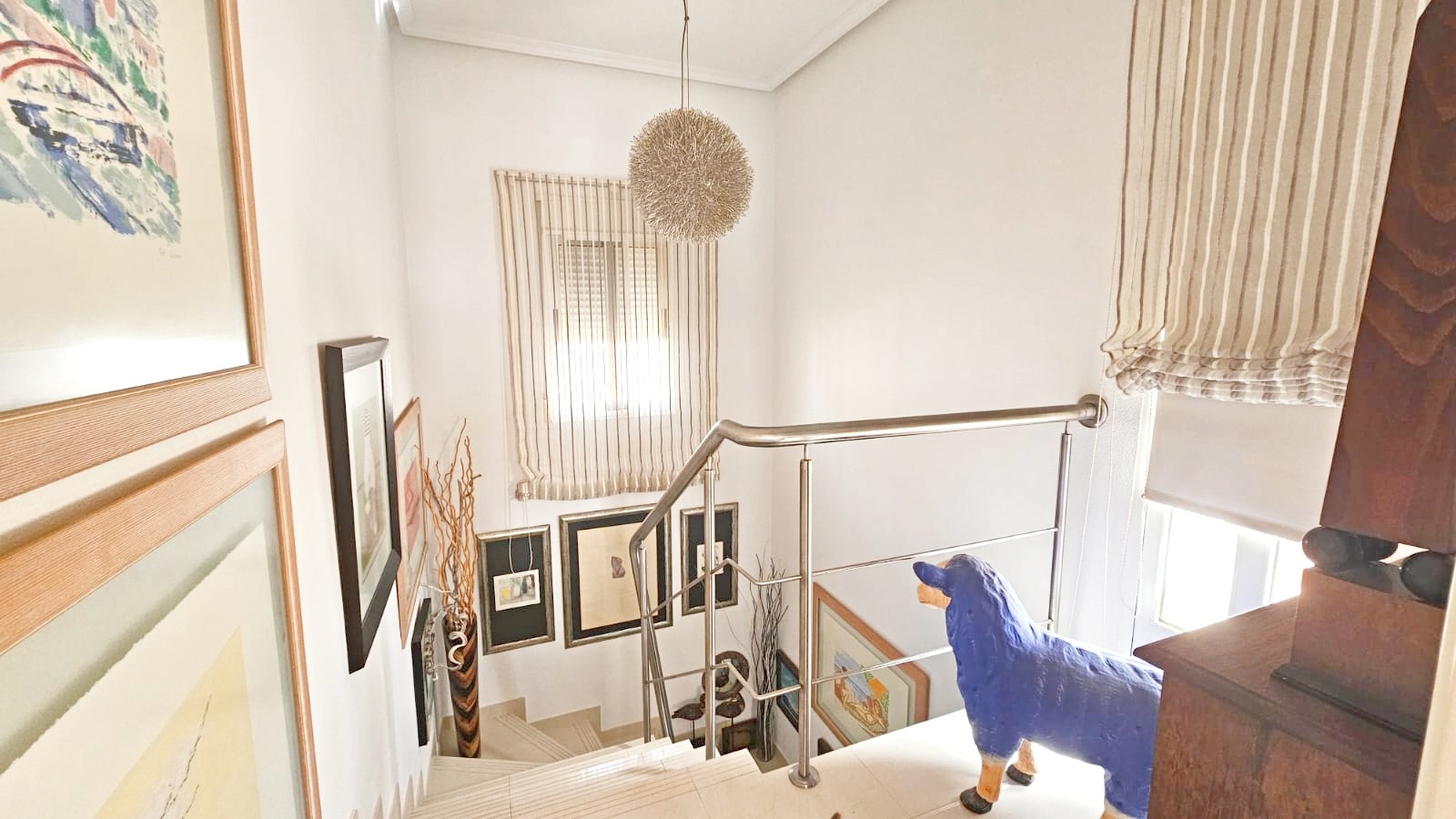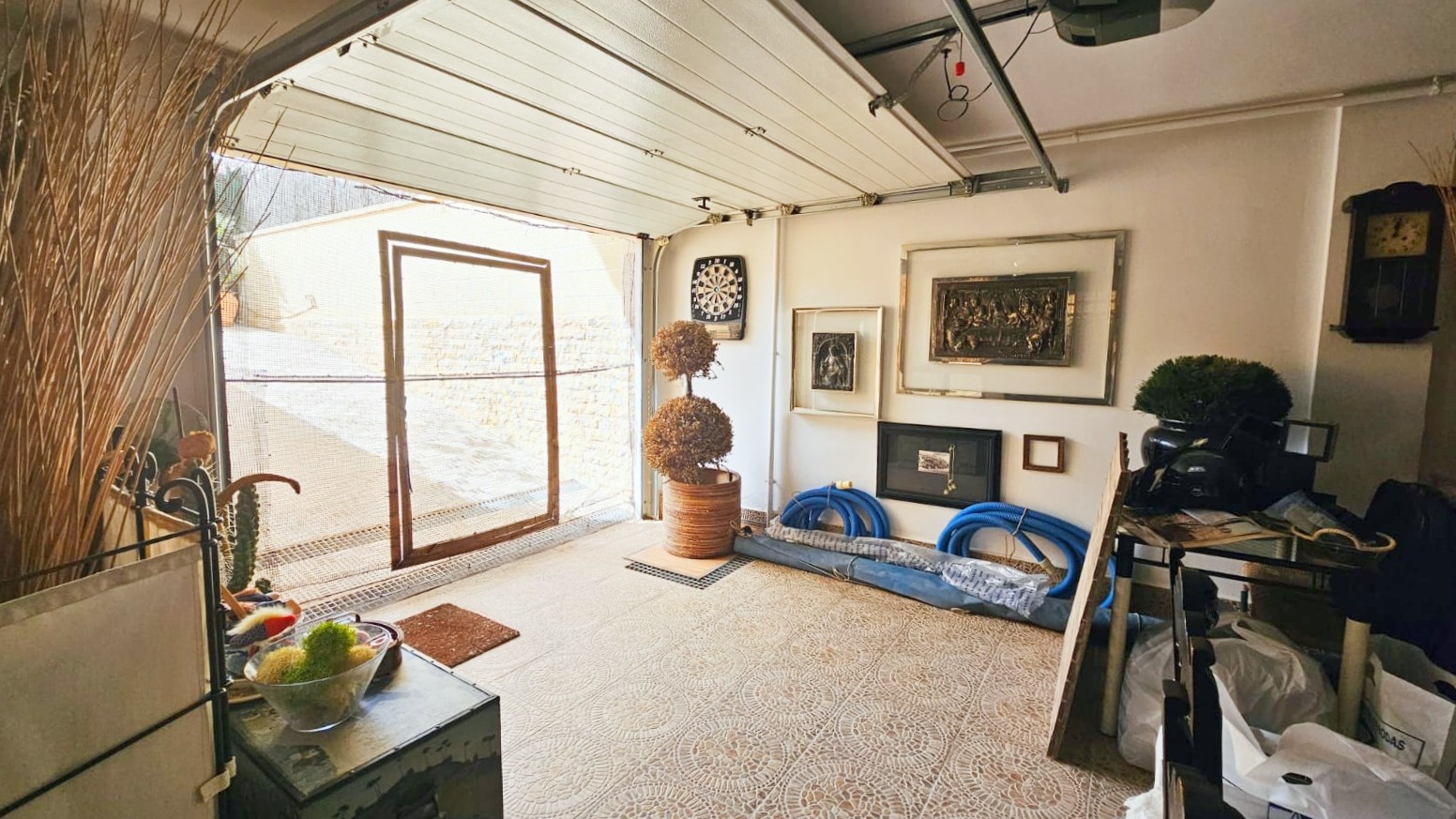 upstairs you find the master bedroom with ensuit bathroom and a big balcony that surrounds half of the property. Down stairs we find the basement, with space enough to put 3 cars inside. It's adapted with a sapace divided in living room area, one bedroom and a toilet.