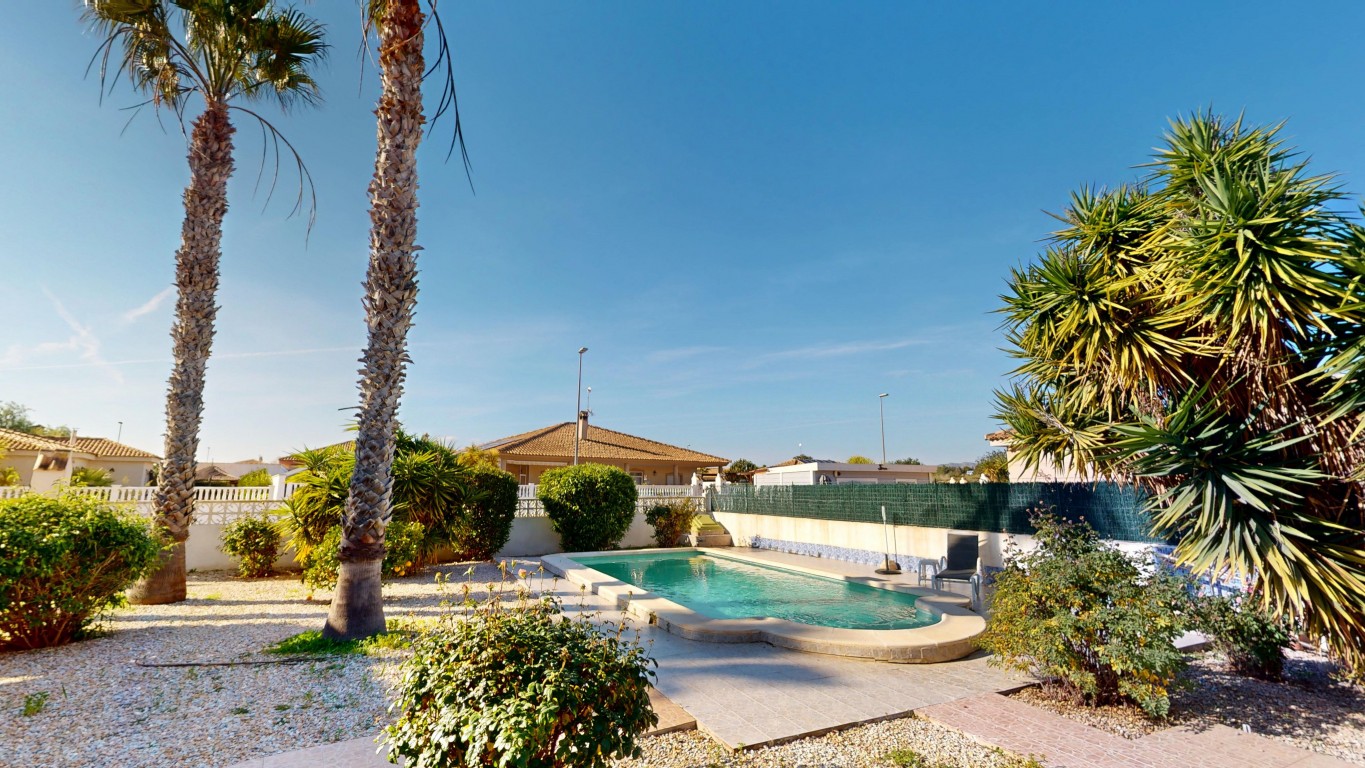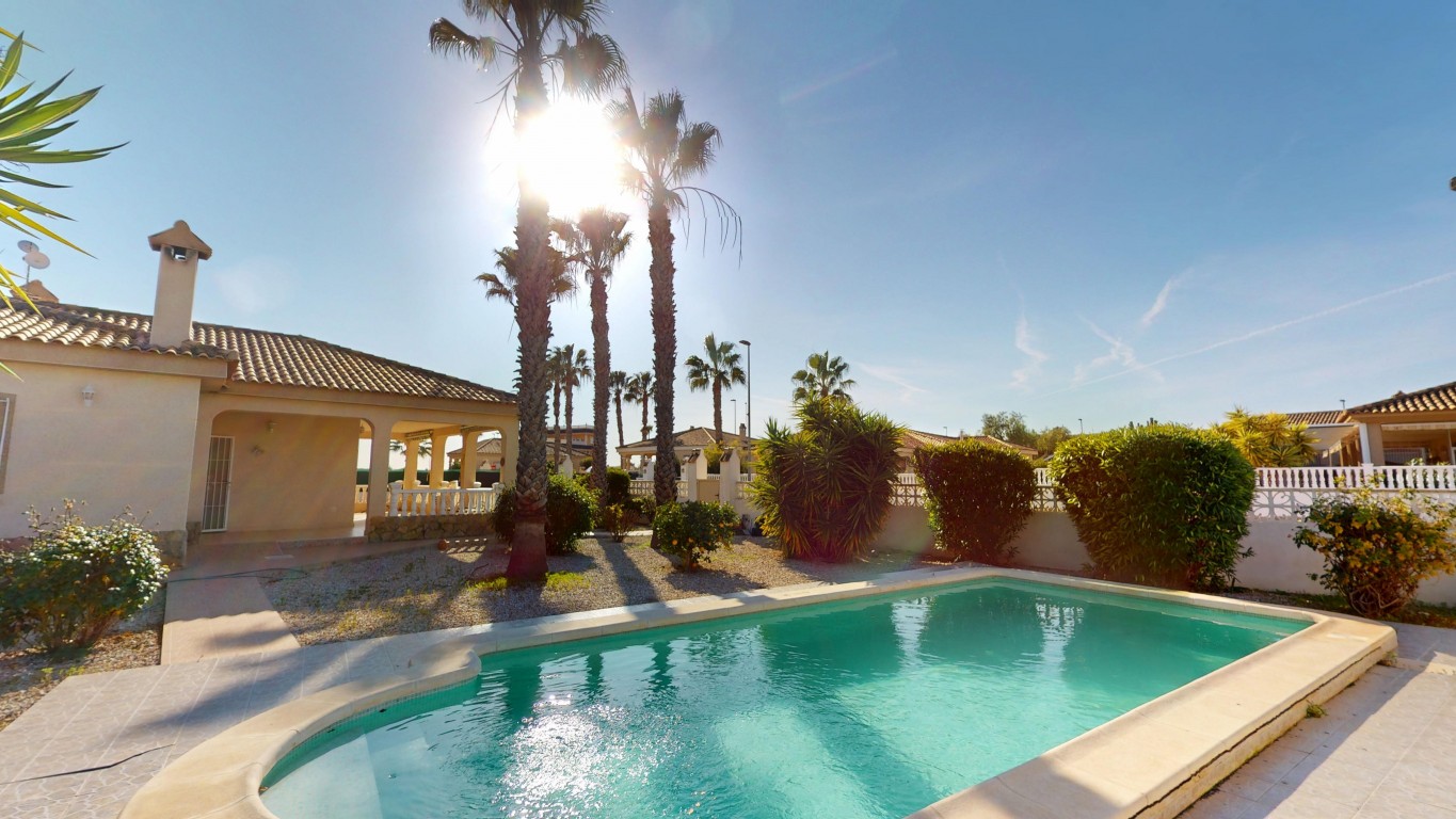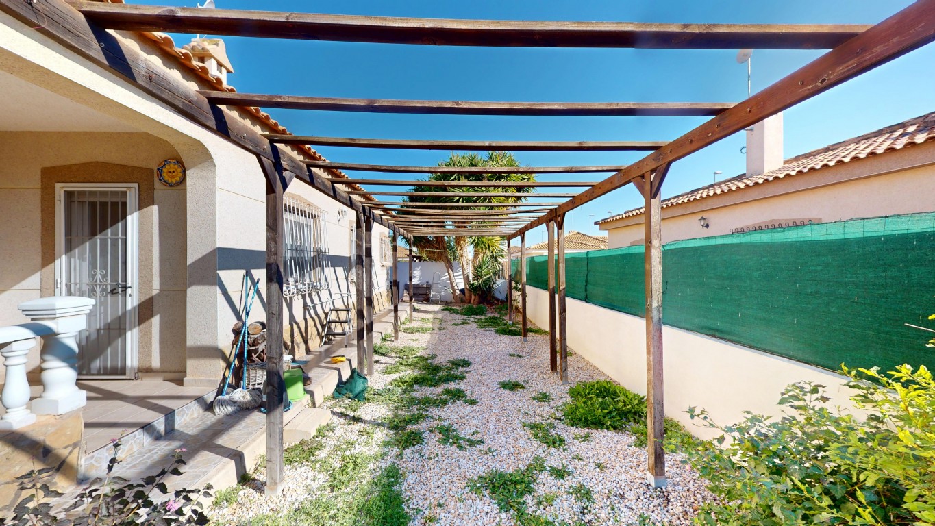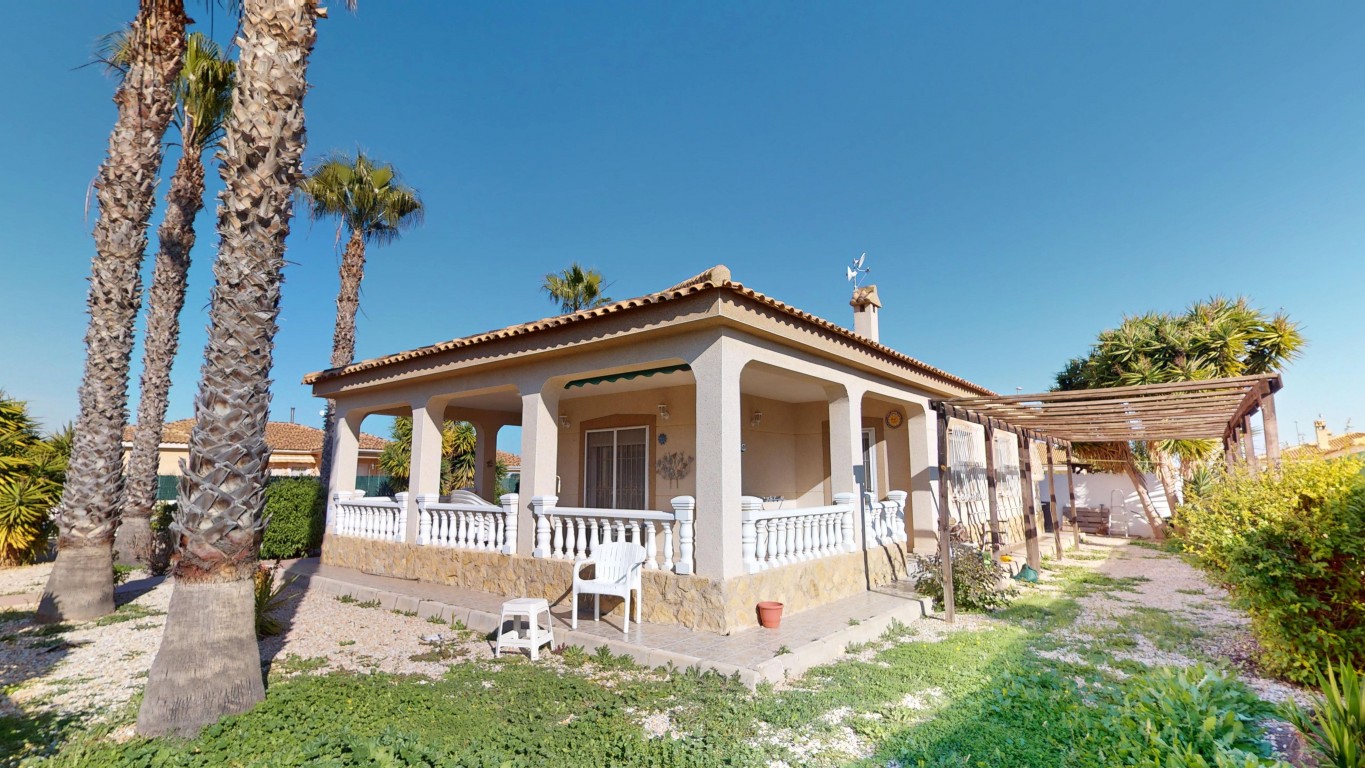 De villa staat op een perceel van 750 m² en biedt volop buitenruimte. Aan de voorzijde van het pand bevindt zich een groot overdekt terras, vanwaar u direct toegang heeft tot het privézwembad – perfect om te ontspannen en te genieten van het Spaanse klimaat.