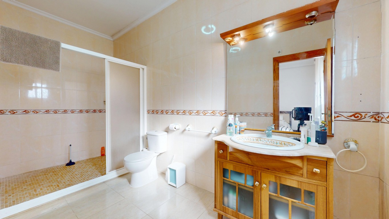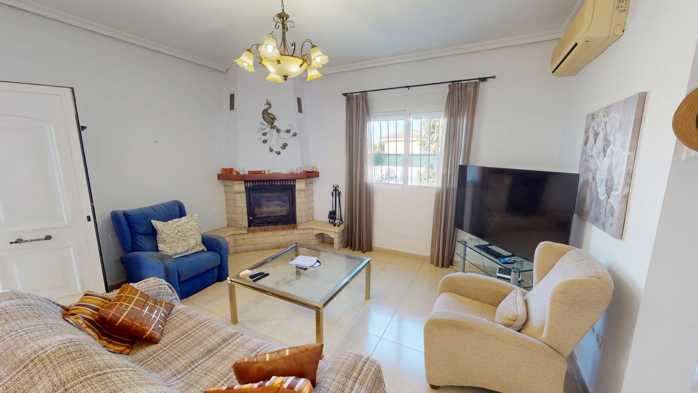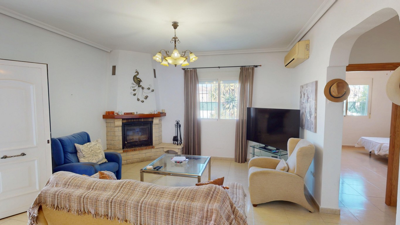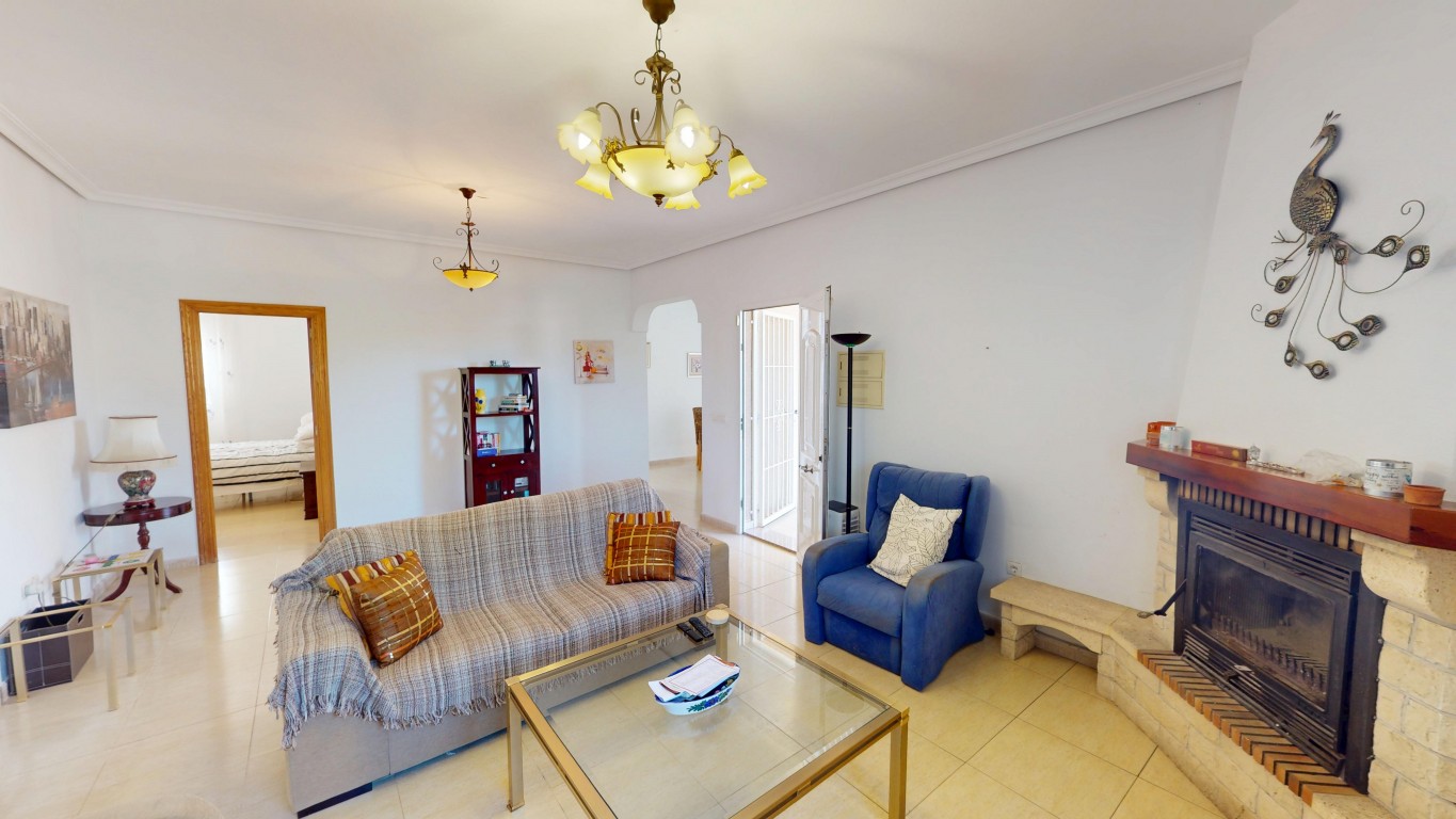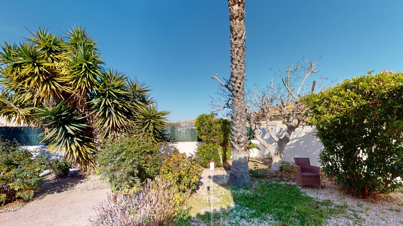 De villa staat op een perceel van 750 m² en biedt volop buitenruimte. Aan de voorzijde van het pand bevindt zich een groot overdekt terras, vanwaar u direct toegang heeft tot het privézwembad – perfect om te ontspannen en te genieten van het Spaanse klimaat.