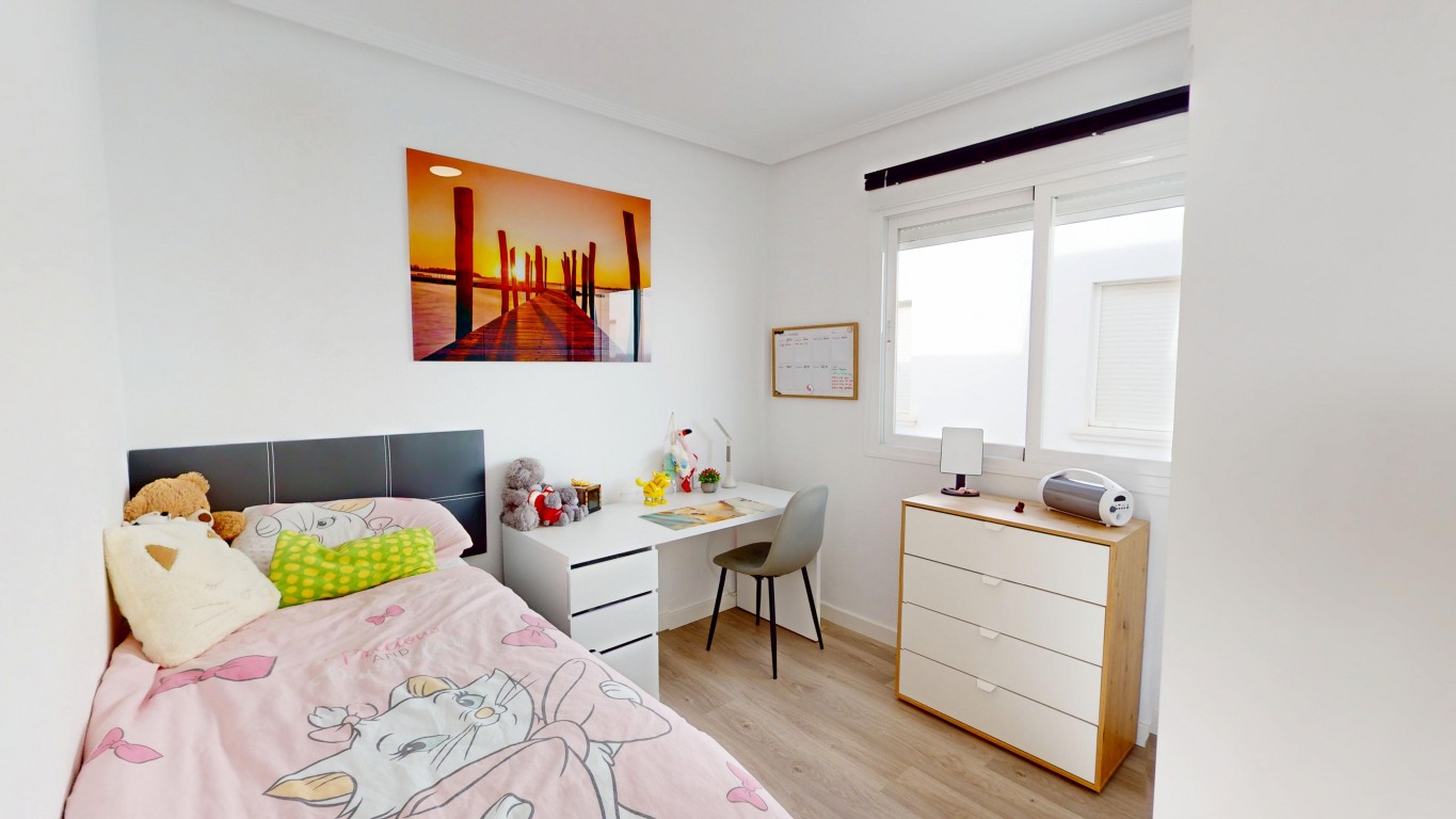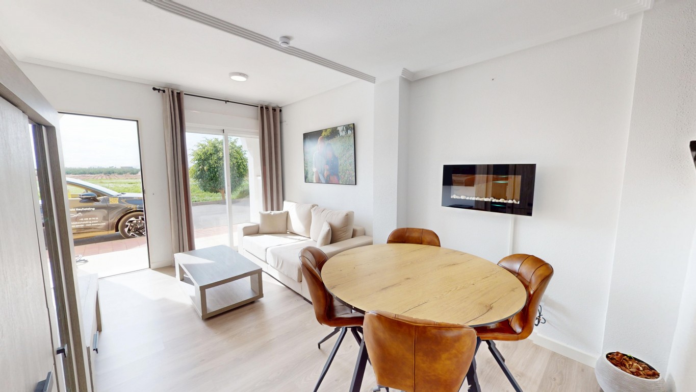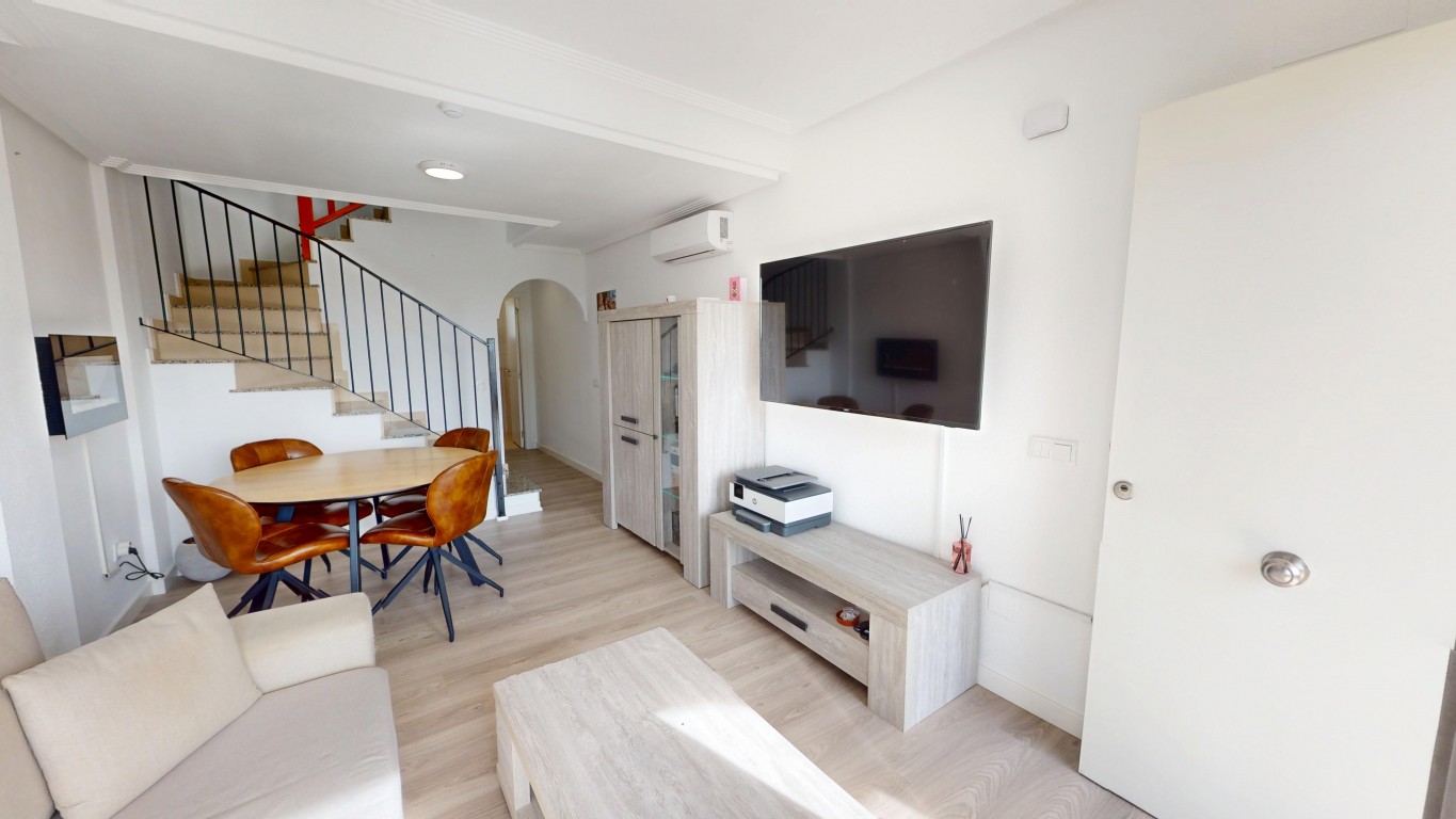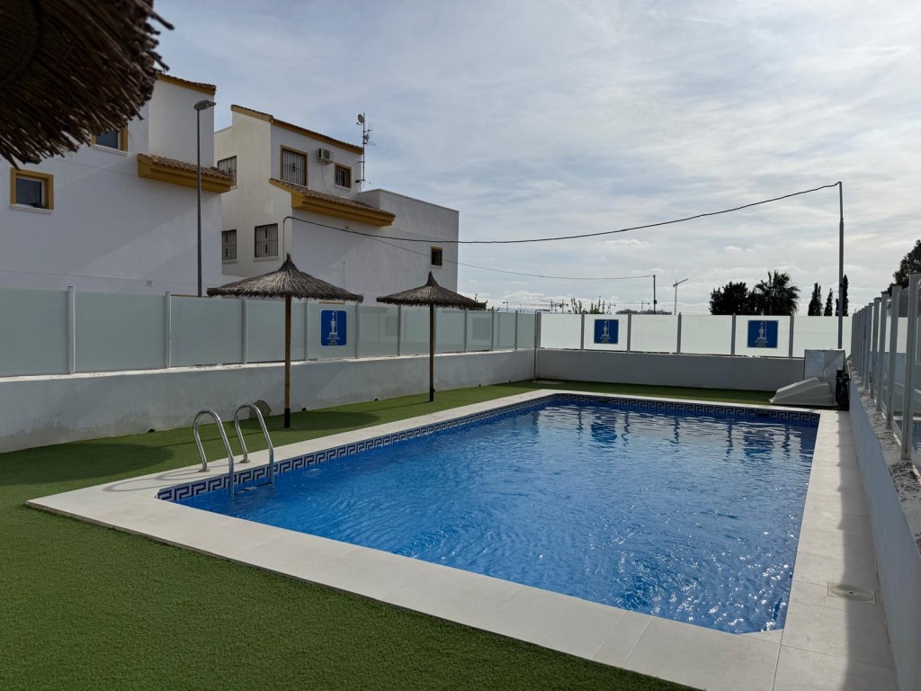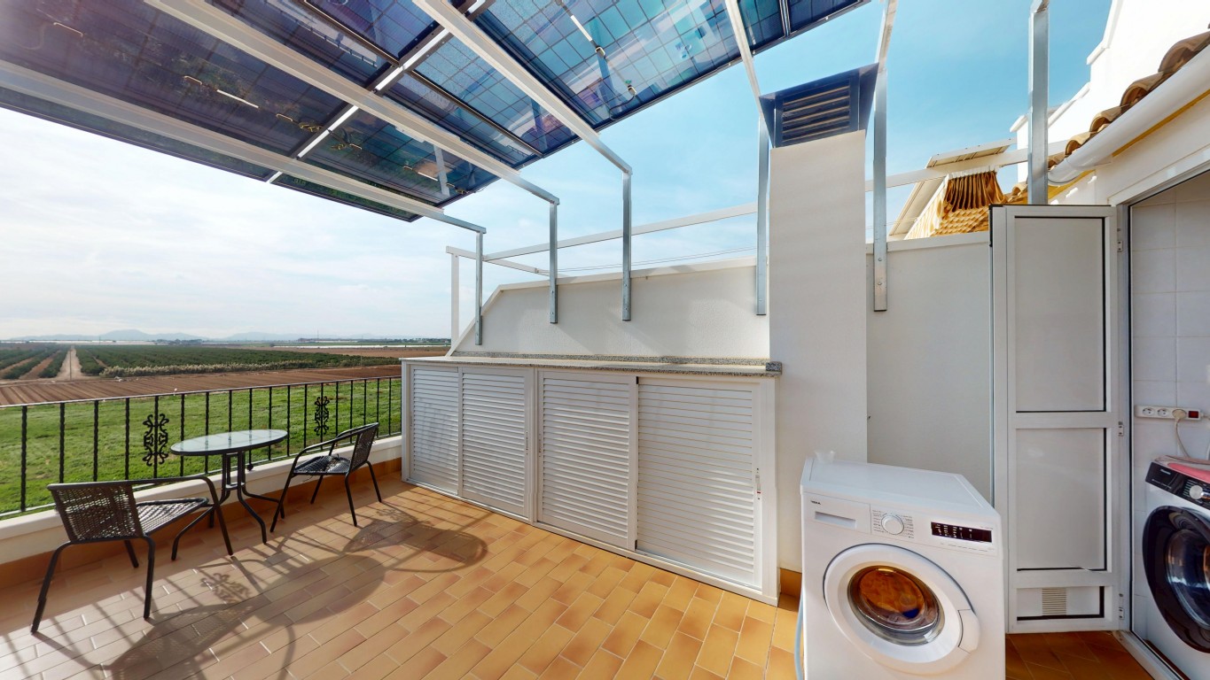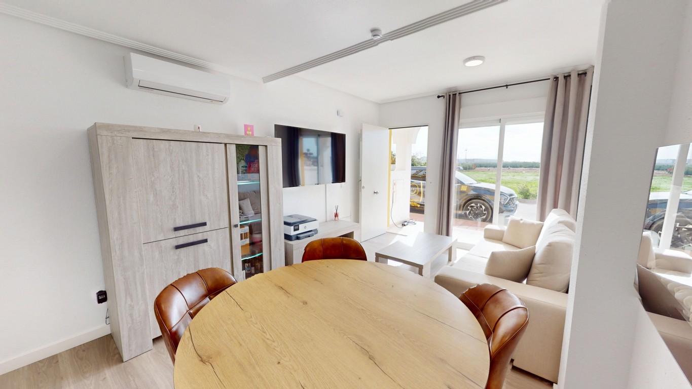 This charming townhouse in Santa Rosalia, renovated in 2021, offers a comfortable and bright living environment. The property features three bedrooms and one bathroom, with an additional separate toilet on the ground floor. Thanks to its south-facing orientation, the home enjoys natural light throughout the day and offers beautiful open views over the surrounding fields. The upper-level solarium is the perfect place to relax while taking in the stunning scenery. The house is equipped with ten solar panels and air conditioning for both heating and cooling, ensuring comfort all year round. Residents can also enjoy the communal swimming pool. Located just four kilometres from the Mar Menor beaches and sold fully furnished, this property is an ideal choice for permanent living or as a holiday home.